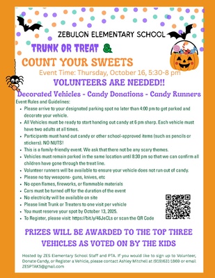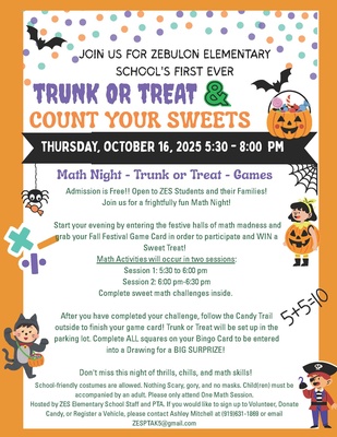 Get ready for a frightfully fun evening at Zebulon Elementary School’s first-ever Trunk or Treat & Count Your Sweets! This family-friendly Math Night and Fall Festival is free and open to all ZES students and their families.